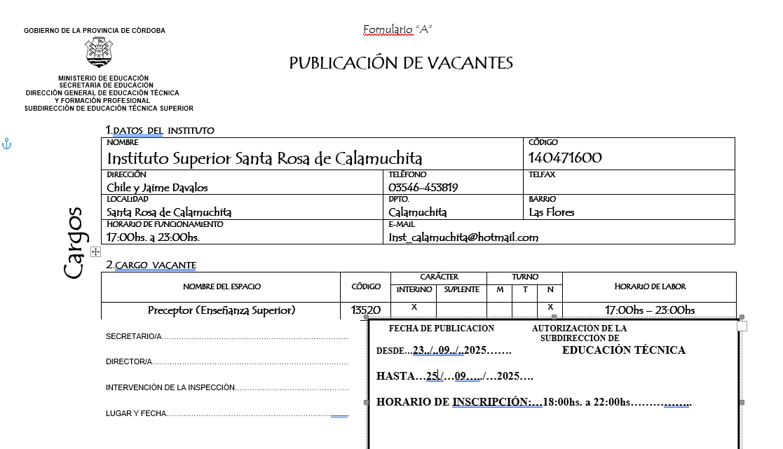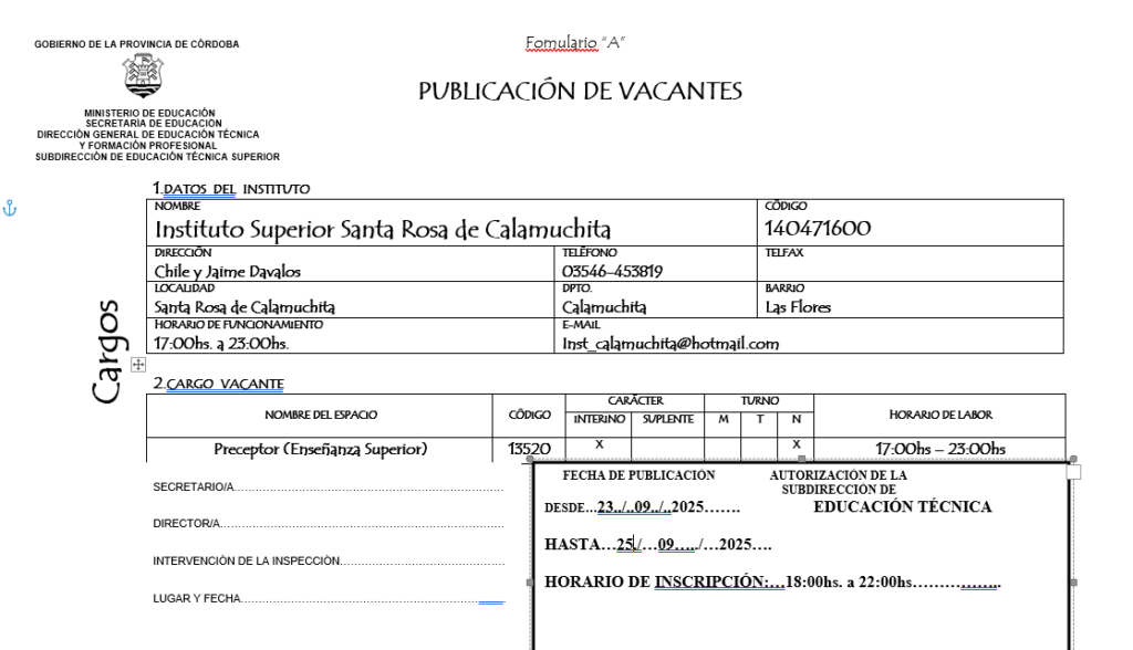 Se encuentra abierta la convocatoria para cubrir el cargo de Preceptor/a del Instituto Superior Santa Rosa de Calamuchita